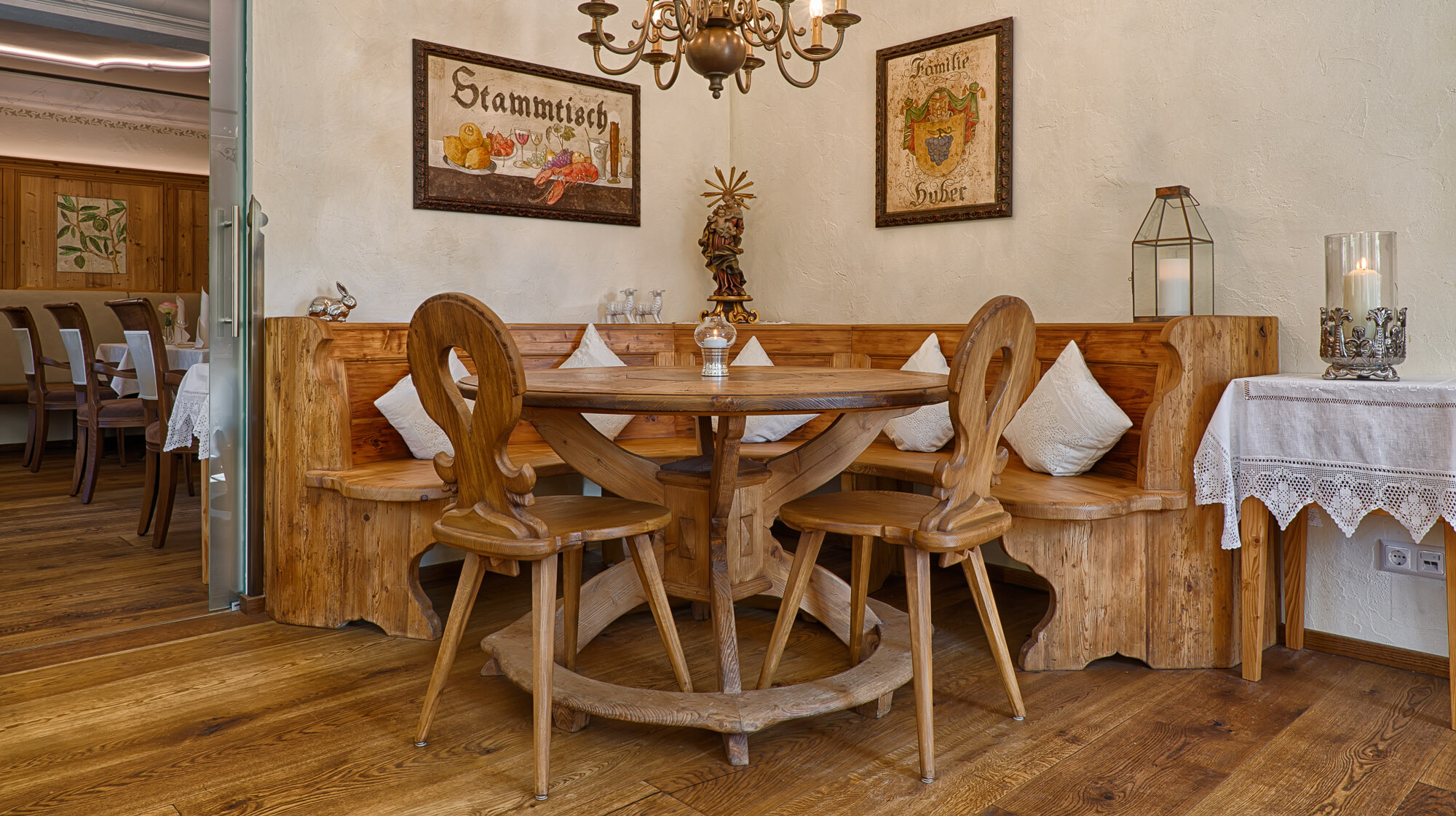 Stabiles Kreuzgestell mit Fußablage (Vergeltsgottbrett) für maximale Beinfreiheit für alle am Tisch.