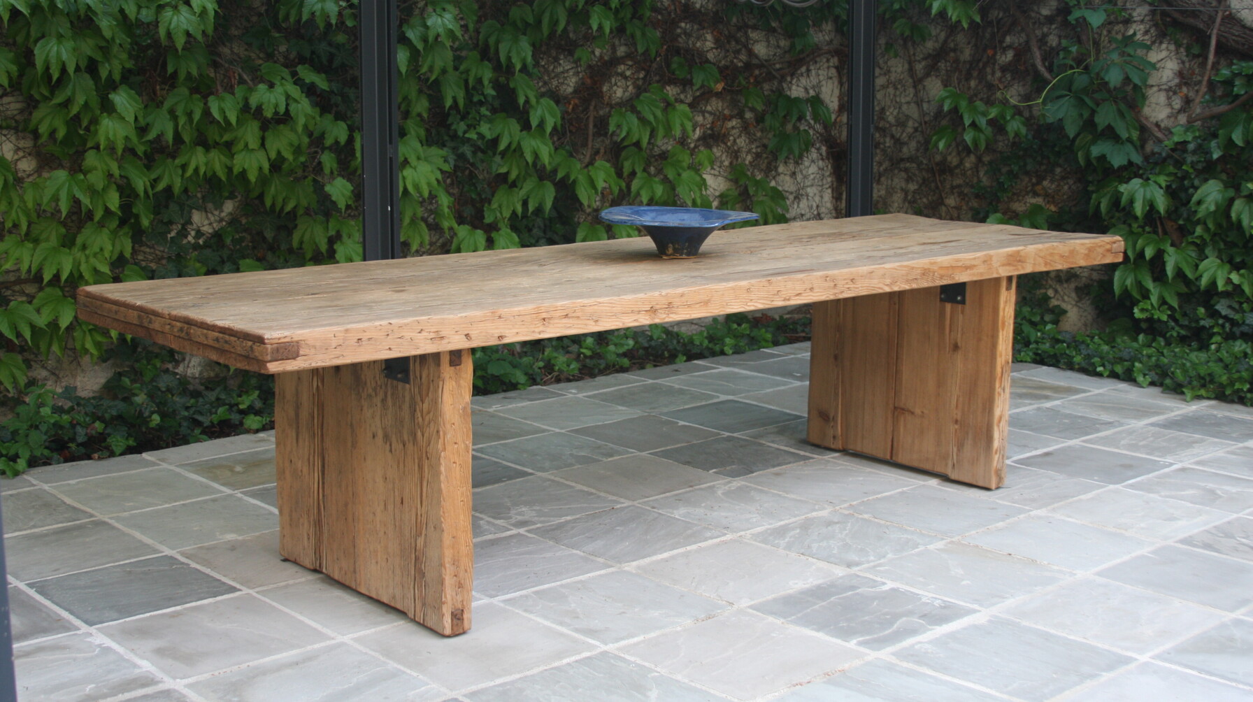 Formal schlichter und reduzierter Tisch, der mit seinem unglaublichen Material besticht. Die Wangen und die Tischplatte sind aus extrabreiten Tennenbodenpfosten gefertigt. Die Oberfläche wurde für die problemlose Benützung sorgfältig bearbeitet. Die Füße sind mit einer Stahlkonstruktion mit der Platte verbunden und abnehmbar.