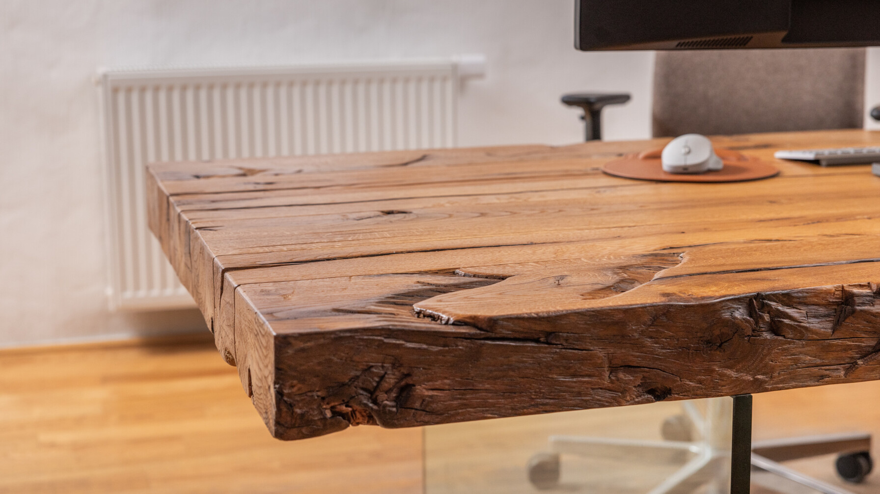 Mit unserem Altholz-Bürotisch aus alter Eiche schaffen Sie einen Arbeitsplatz, der durch seine lebhafte Maserung und handbehauene Kanten eine authentische Atmosphäre schafft. Die Kombination aus robustem Glasfuß und fein geölter Oberfläche garantiert langlebige Qualität und zeitlose Eleganz in Ihrem Büro.