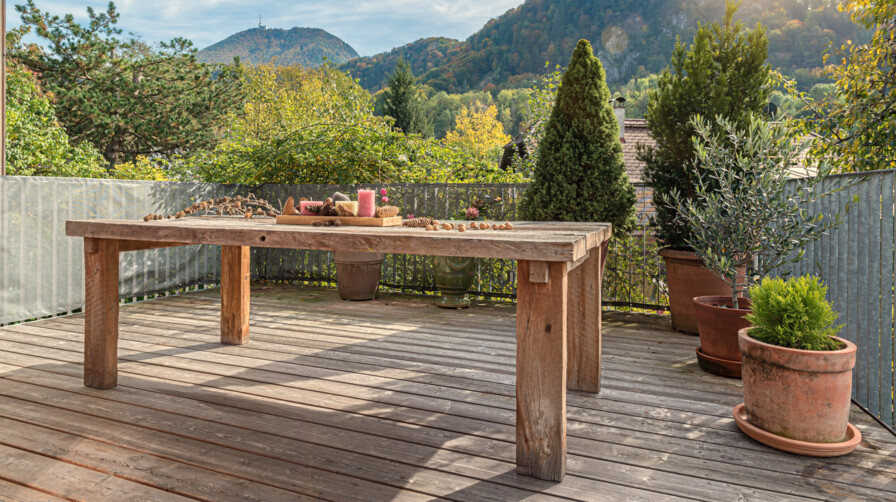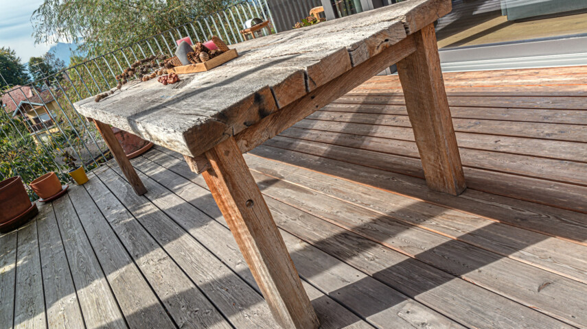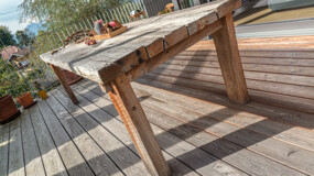 Rustikaler Ess-/Terrassen-/Besprechungstisch mit viel interessanter Struktur und sehr unebener Oberfläche, natürliche Vergrauung setzt nach der Lieferung wieder ein. Stabile, wetterfeste Holzverbindung, Material aus Eiche Altholz mit Originalstruktur (Blockhauswand).